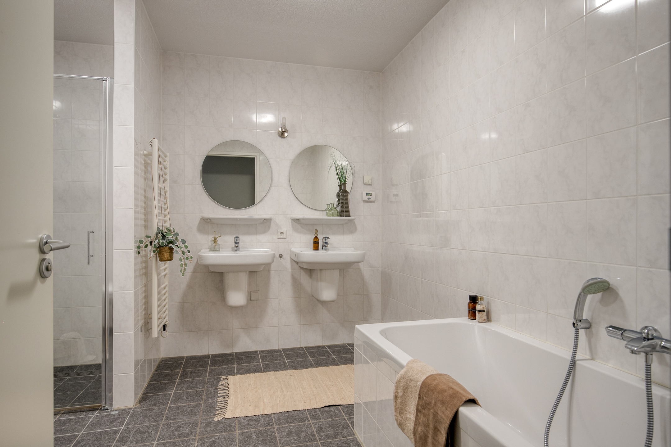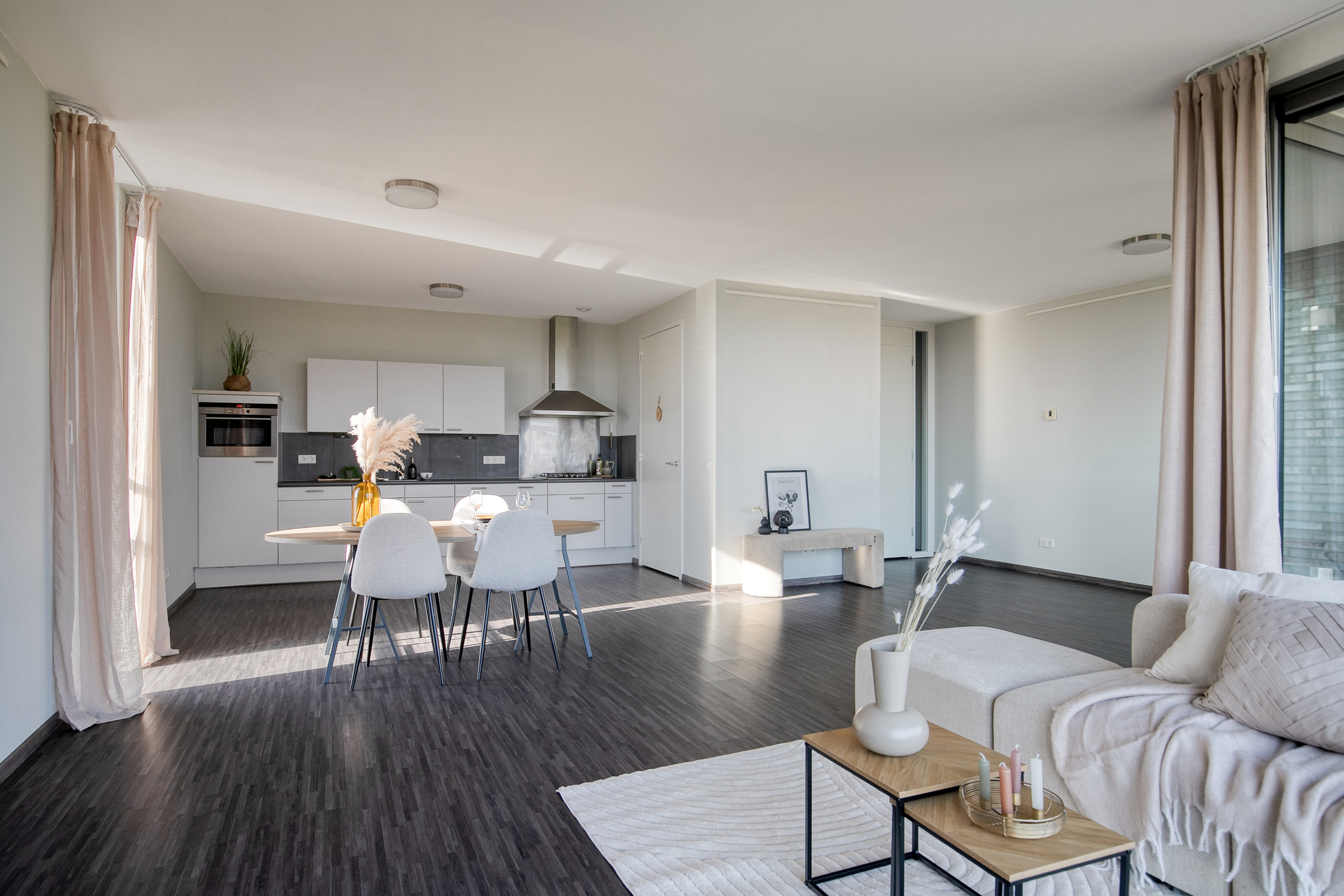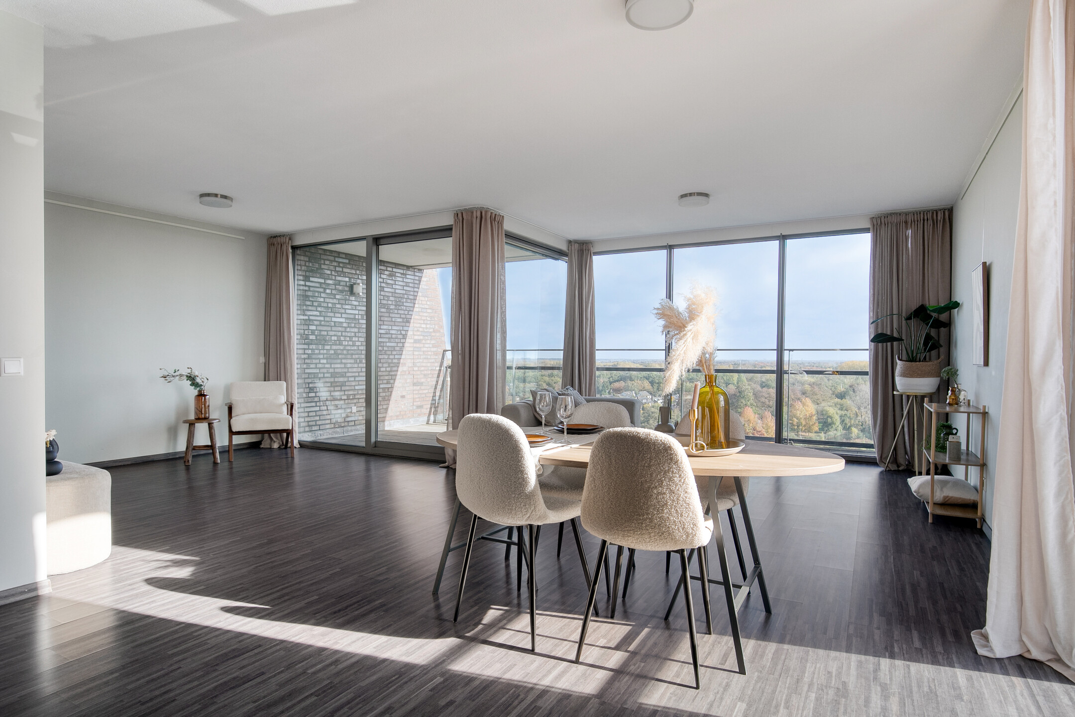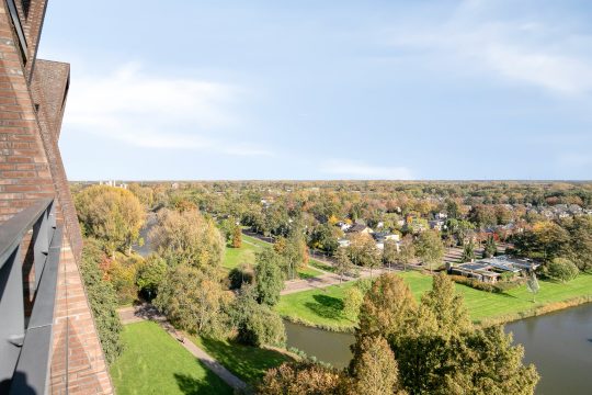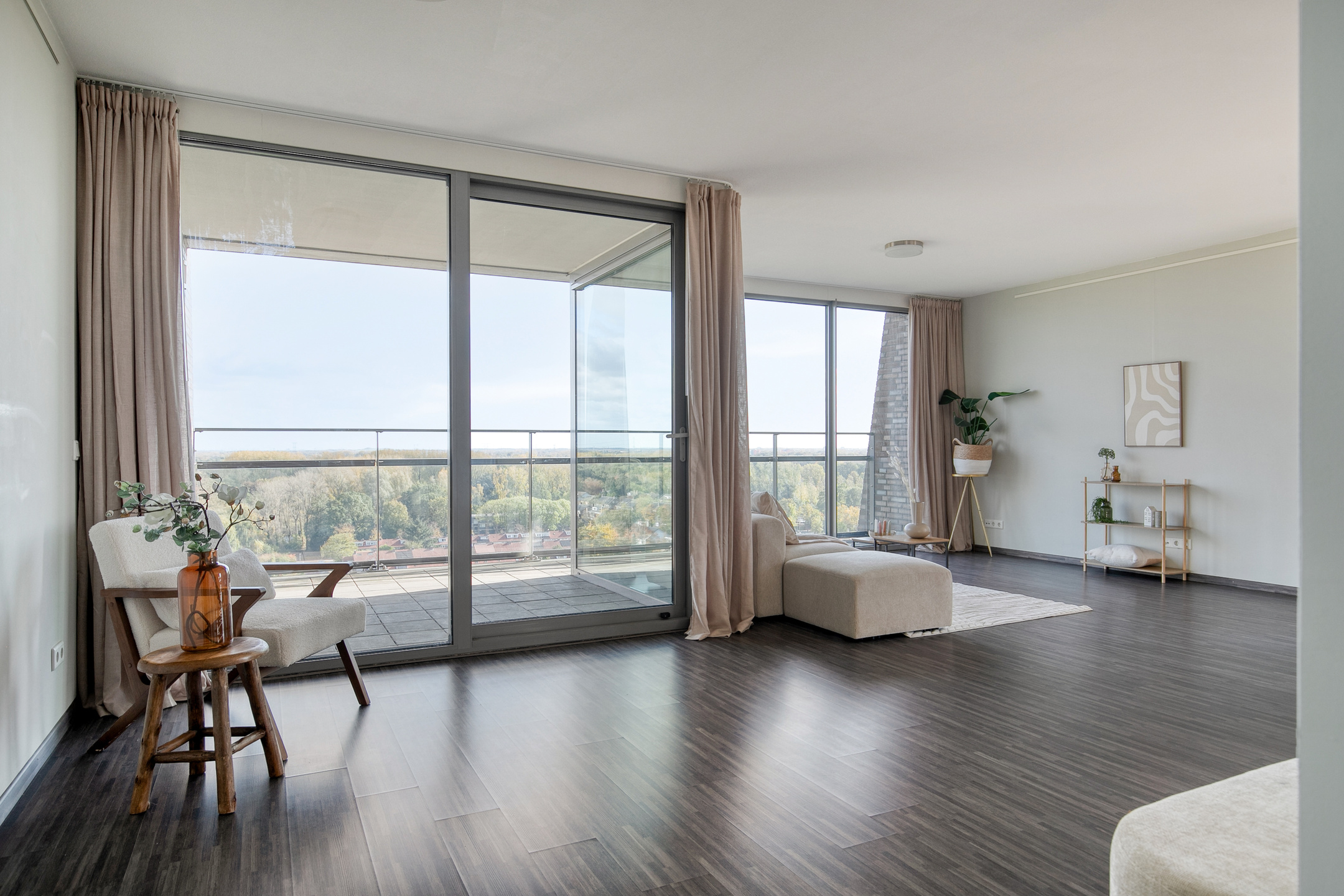 In de living biedt de kamerbrede pui een panoramisch en weids zicht op het groen in de omgeving. Er is volop ruimte voor een royale zit- en eethoek. Een schuifpui biedt toegang tot het balkon. Mooi detail in de eethoek is het Frans balkon in de zijgevel dat ook aan die zijde zorgt voor lichtinval en een mooi uitzicht. De keuken heeft een moderne inrichting met een gaskookplaat, rvs afzuigschouw, vaatwasser, koelkast en combi magnetron. Vanuit de keuken is de praktische inpandige bergruimte bereikbaar. Hierin bevindt zich de cv combiketel (2009), verdeler van de vloerverwarming, unit mechanische ventilatie en aansluitingen voor de wasapparatuur. Het balkon beslaat de volle breedte van het appartement. Het diepste gedeelte is heerlijk ruim en deels overdekt. Hier geniet je van het uitzicht tijdens jouw koffietje in de ochtendzon of met gasten op een mooie zomeravond. Het appartement heeft twee ruim bemeten slaapkamers. Beiden kamers beschikken over een kamerbrede schuifpui en toegang tot het tweede balkon. Ook hier is het uitzicht oneindig en indrukwekkend. De badkamer is aangenaam ruim. Ook is deze zeer compleet ingericht met twee wastafels, een ligbad, inloopdouche en, achter een discreet muurtje, een tweede toilet met hangcloset. De parkeergarage van het complex is inpandig bereikbaar, zowel via de lift als de trapopgang. Hier vind je de eigen parkeerplaats en de individuele berging. Via een afgesloten, automatisch bedienbare poort bereik je toe- en uitgang van de garage met je auto.