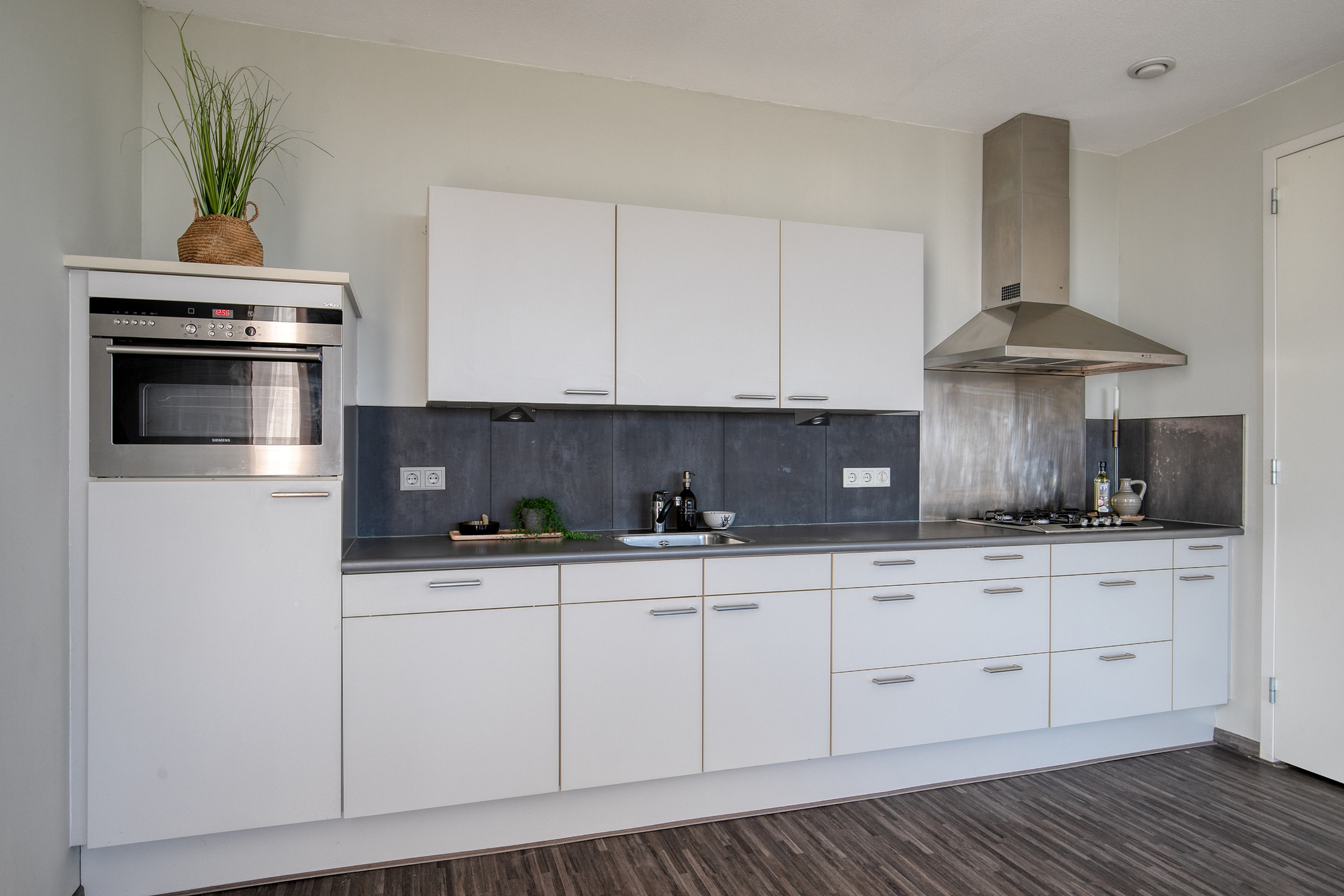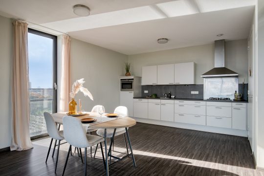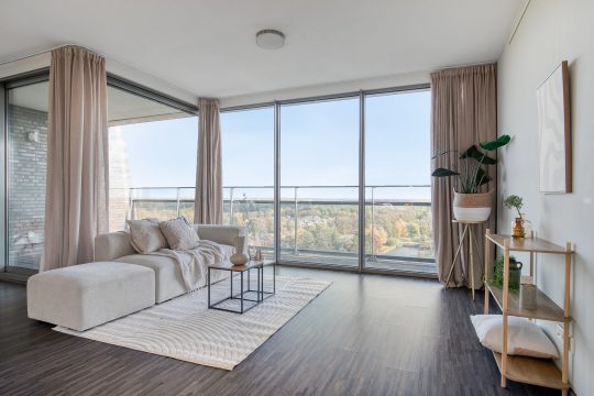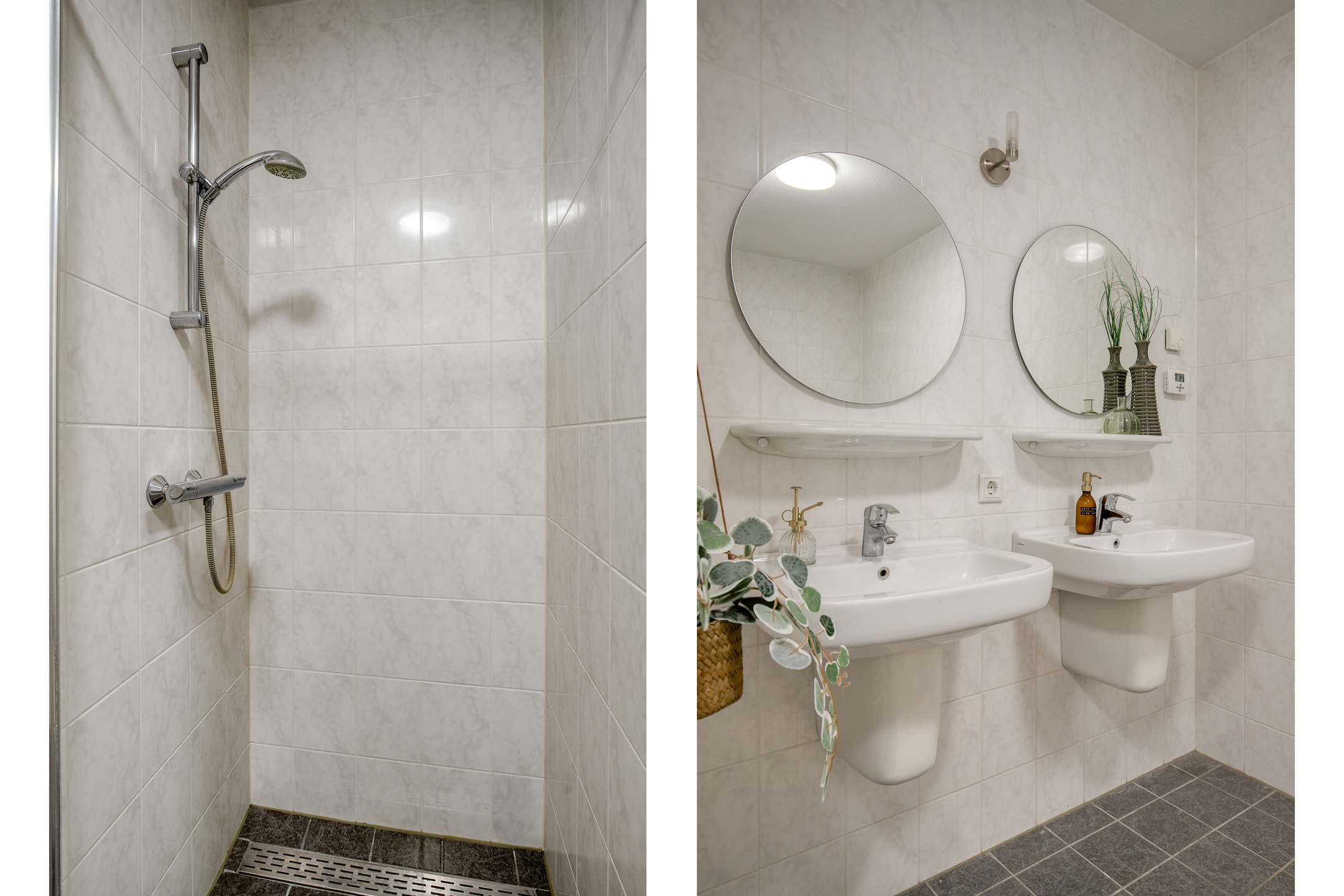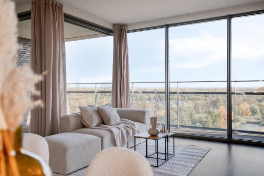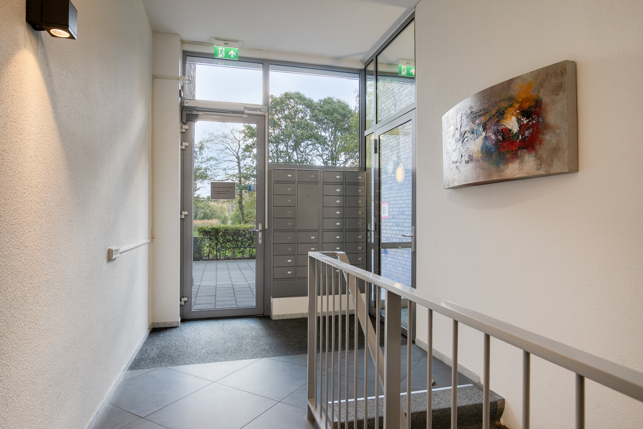 In de living biedt de kamerbrede pui een panoramisch en weids zicht op het groen in de omgeving. Er is volop ruimte voor een royale zit- en eethoek. Een schuifpui biedt toegang tot het balkon. Mooi detail in de eethoek is het Frans balkon in de zijgevel dat ook aan die zijde zorgt voor lichtinval en een mooi uitzicht. De keuken heeft een moderne inrichting met een gaskookplaat, rvs afzuigschouw, vaatwasser, koelkast en combi magnetron. Vanuit de keuken is de praktische inpandige bergruimte bereikbaar. Hierin bevindt zich de cv combiketel (2009), verdeler van de vloerverwarming, unit mechanische ventilatie en aansluitingen voor de wasapparatuur. Het balkon beslaat de volle breedte van het appartement. Het diepste gedeelte is heerlijk ruim en deels overdekt. Hier geniet je van het uitzicht tijdens jouw koffietje in de ochtendzon of met gasten op een mooie zomeravond. Het appartement heeft twee ruim bemeten slaapkamers. Beiden kamers beschikken over een kamerbrede schuifpui en toegang tot het tweede balkon. Ook hier is het uitzicht oneindig en indrukwekkend. De badkamer is aangenaam ruim. Ook is deze zeer compleet ingericht met twee wastafels, een ligbad, inloopdouche en, achter een discreet muurtje, een tweede toilet met hangcloset. De parkeergarage van het complex is inpandig bereikbaar, zowel via de lift als de trapopgang. Hier vind je de eigen parkeerplaats en de individuele berging. Via een afgesloten, automatisch bedienbare poort bereik je toe- en uitgang van de garage met je auto.
