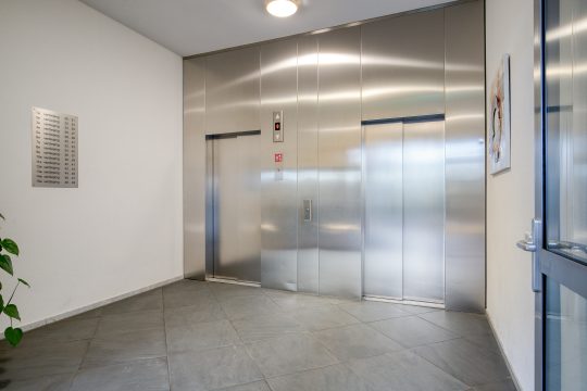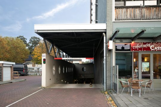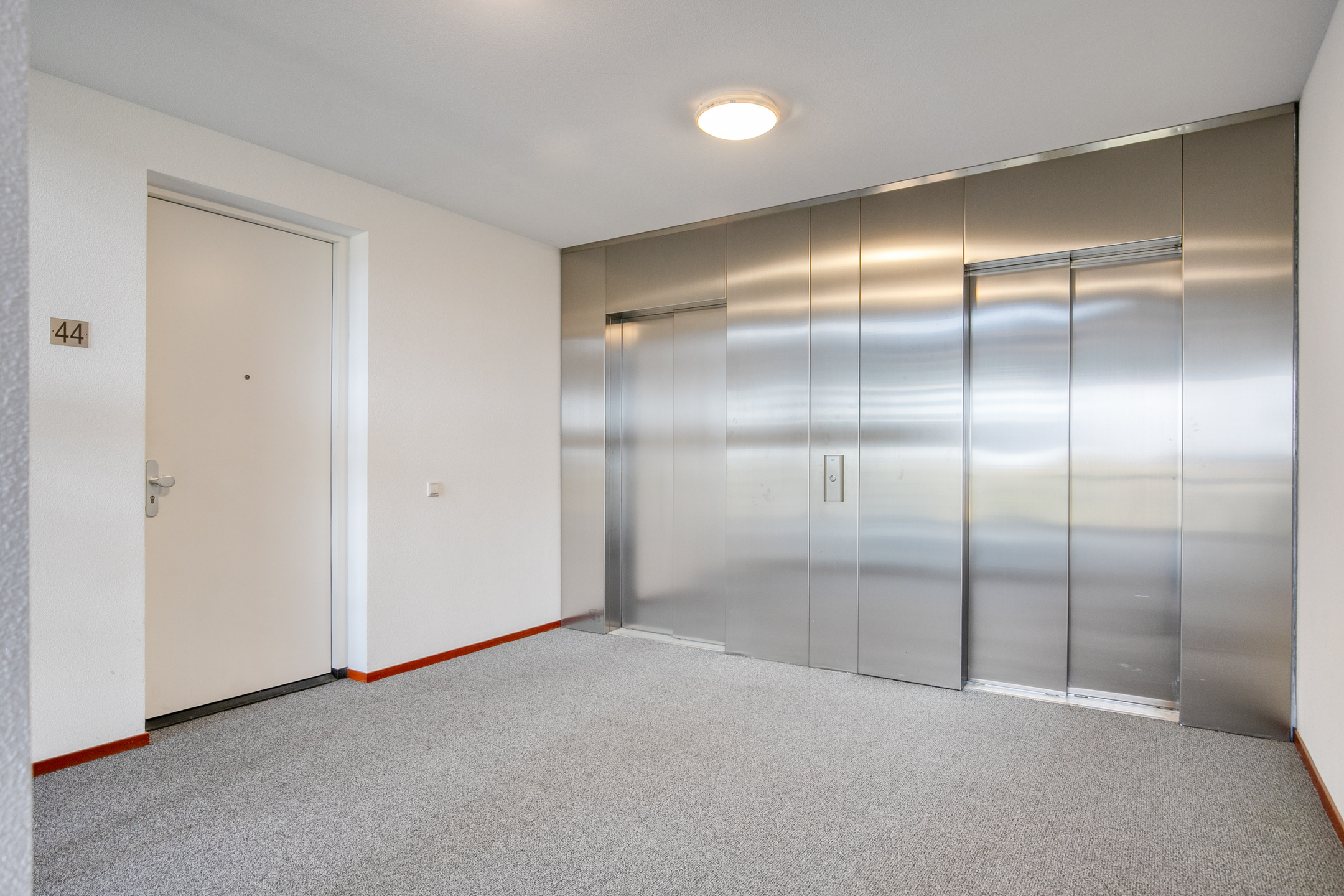 De centrale centrale naar de appartementen grenst aan het parkeerterrein bij de winkels. In de centrale hal bevinden zich de brievenbussen, het bellentableau met videofoon, de lift en trapopgang richting alle verdiepingen en de parkeerkelder.