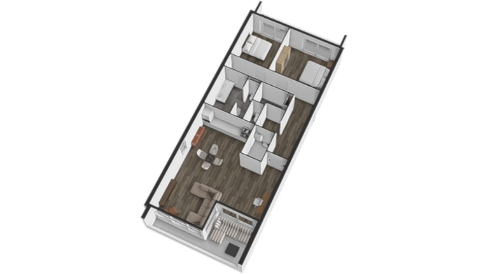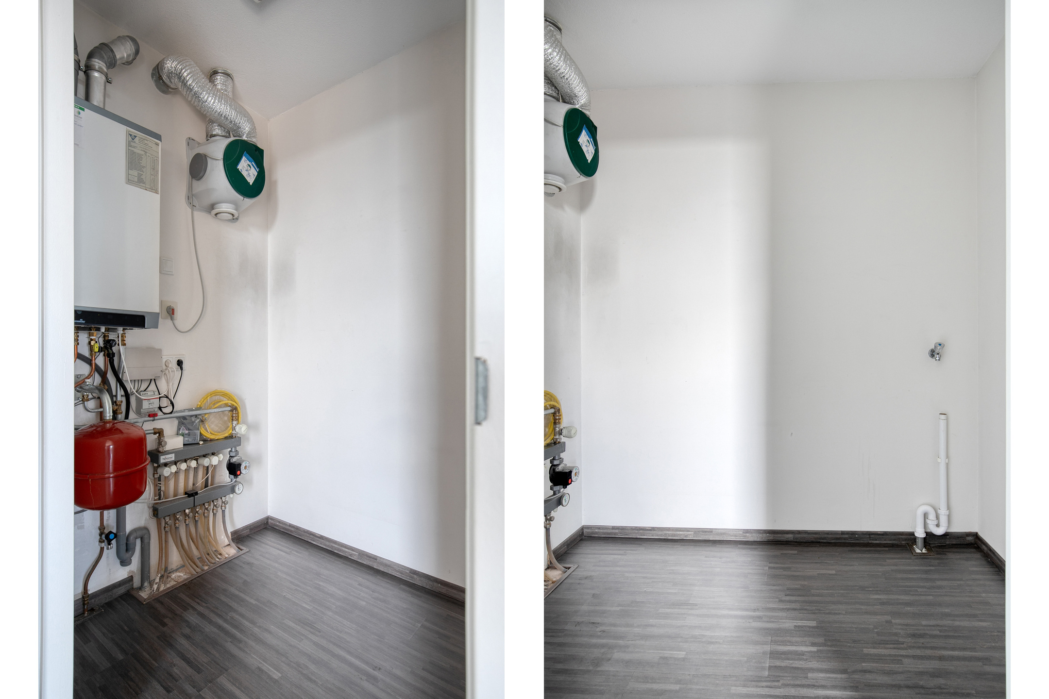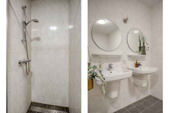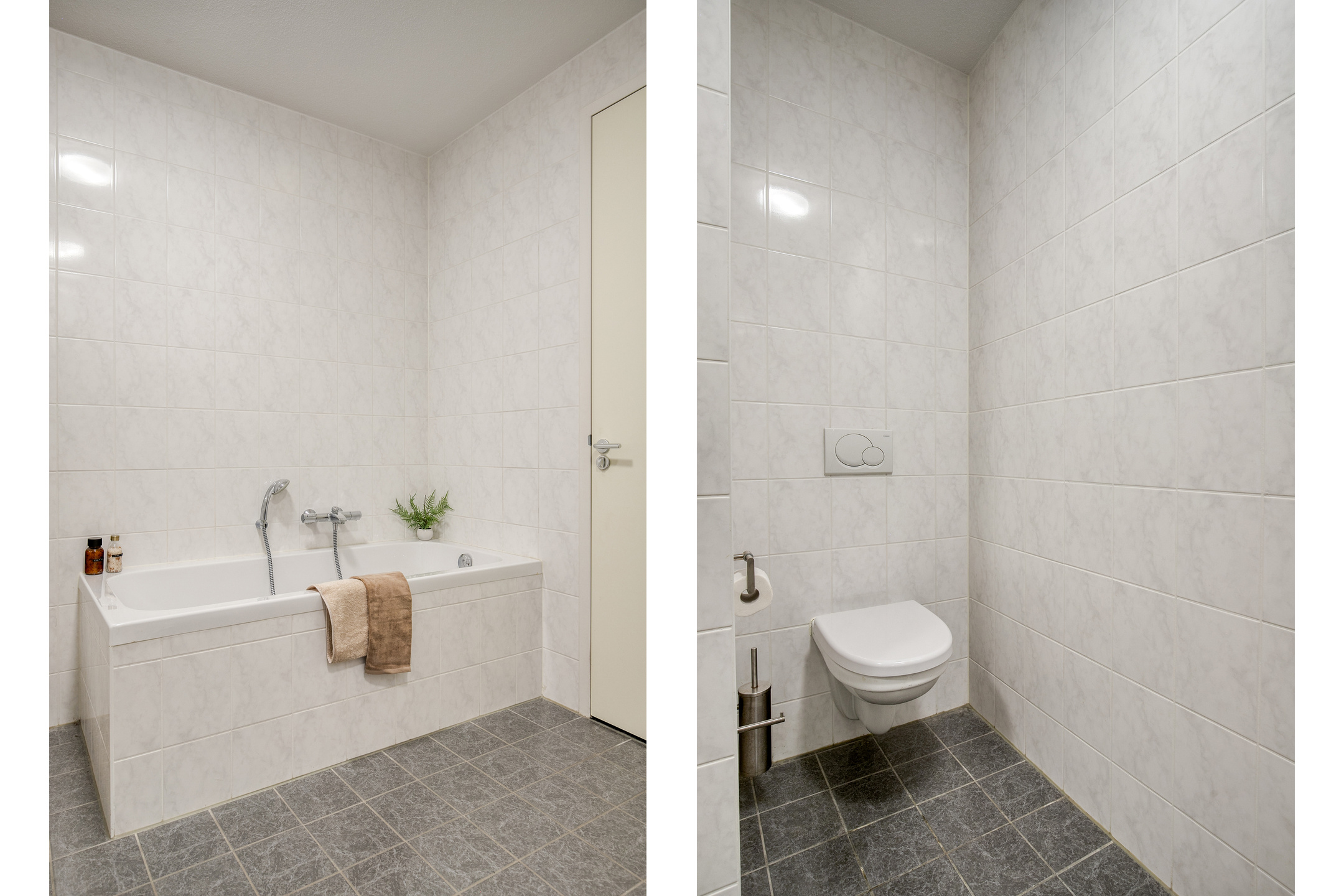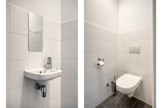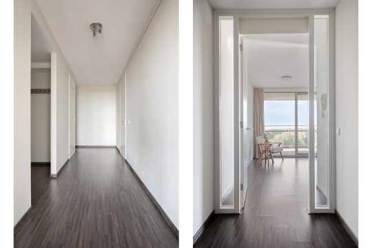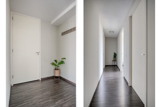 De hal op de verdieping deel je met slechts één appartement en biedt volop lichtinval. De binnenkomst in het appartement is prettig in de hal die de leefruimtes scheidt van de slaapvleugel. De jassen aan de garderobe zijn mooi verscholen achter een muurtje. Hier bevindt zich ook de betegelde toiletruimte met hangcloset en fonteintje. De hal, living en slaapkamers zijn voorzien van een laminaatvloer in warme houttint.