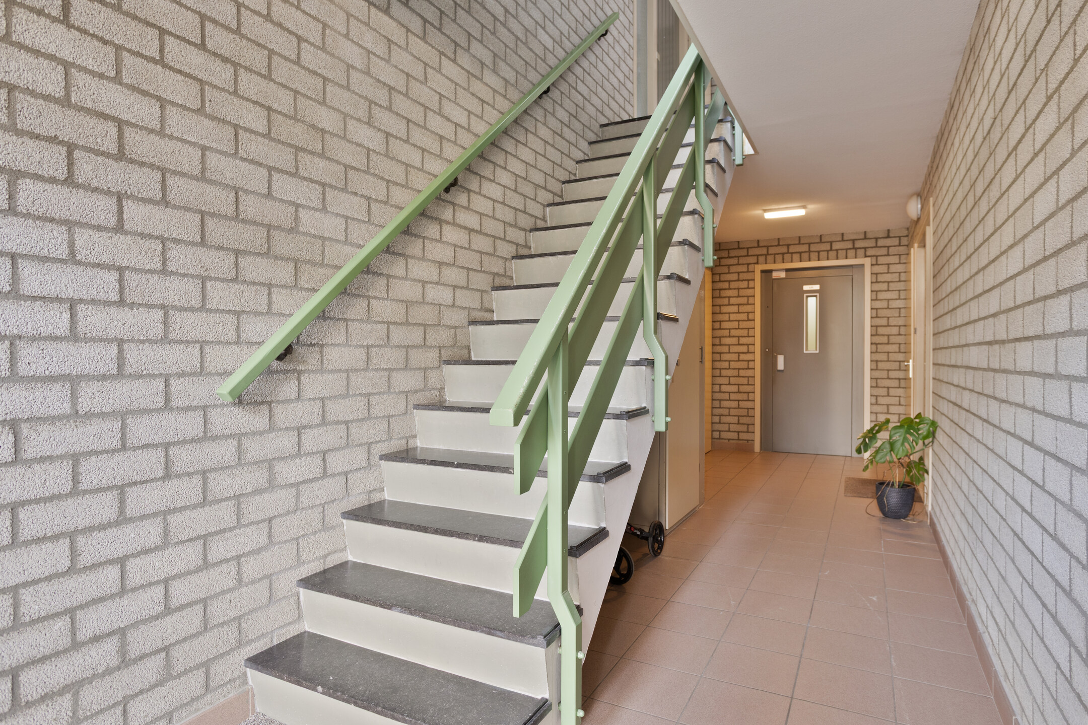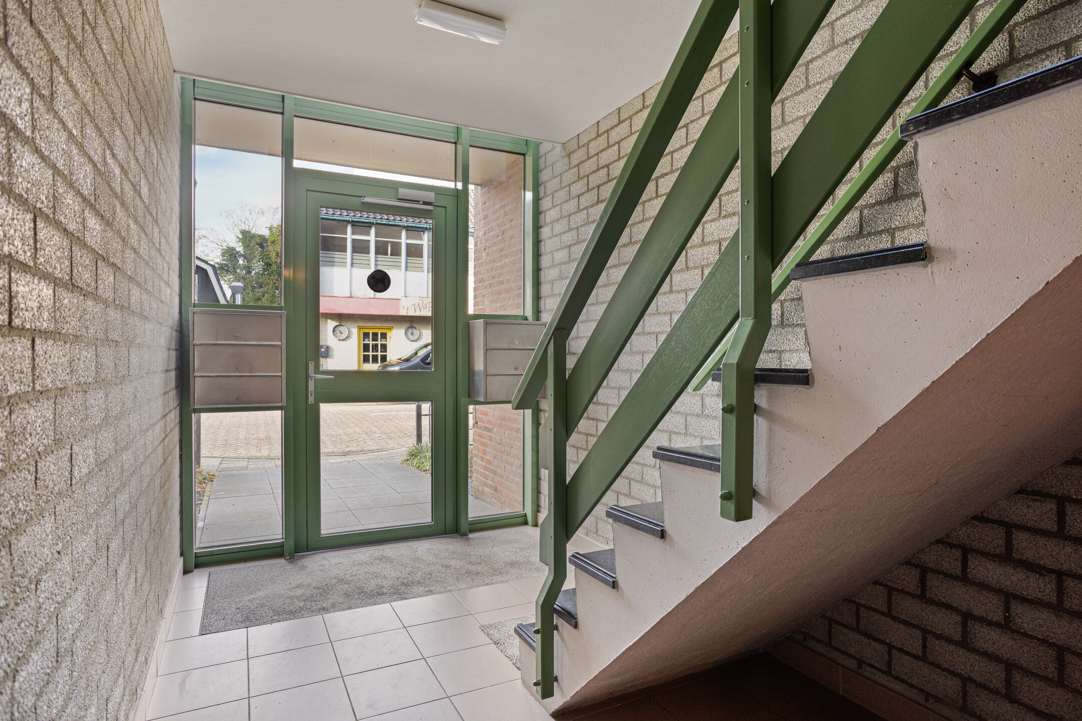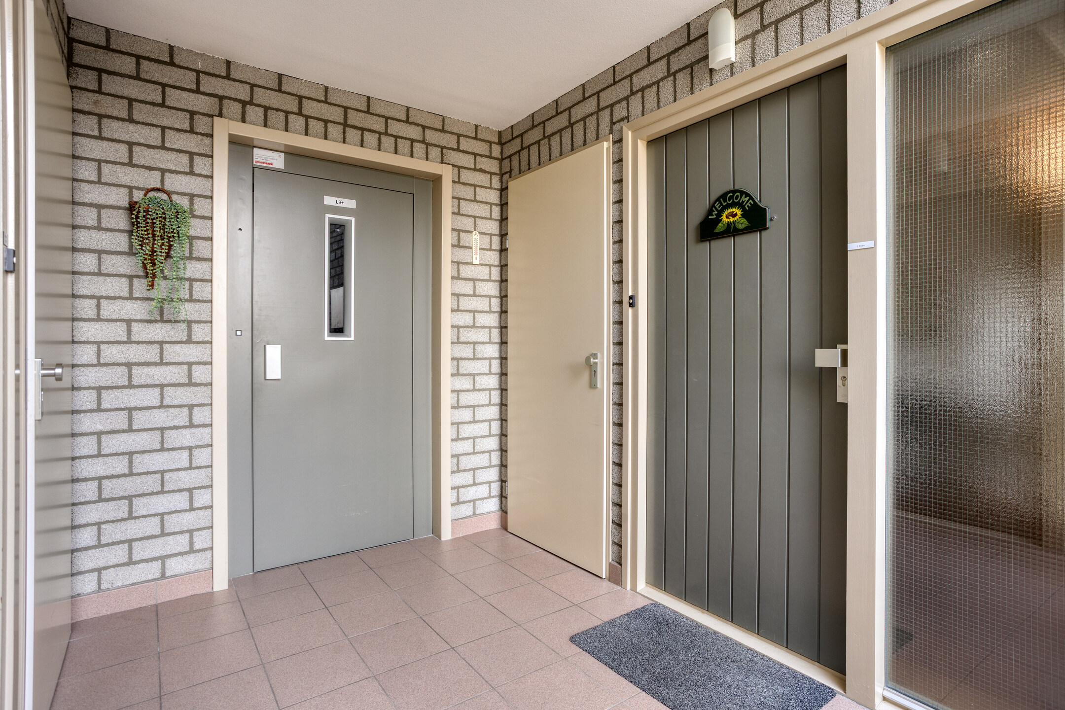 De overdekte entree van het appartementencomplex is voorzien van het bellentableau met videofoon, en de brievenbussen. De nokhoge raampartijen zorgen hier voor een optimale lichtinval en een prettige entree. De hal is voorzien van de trapopgang en de lift.