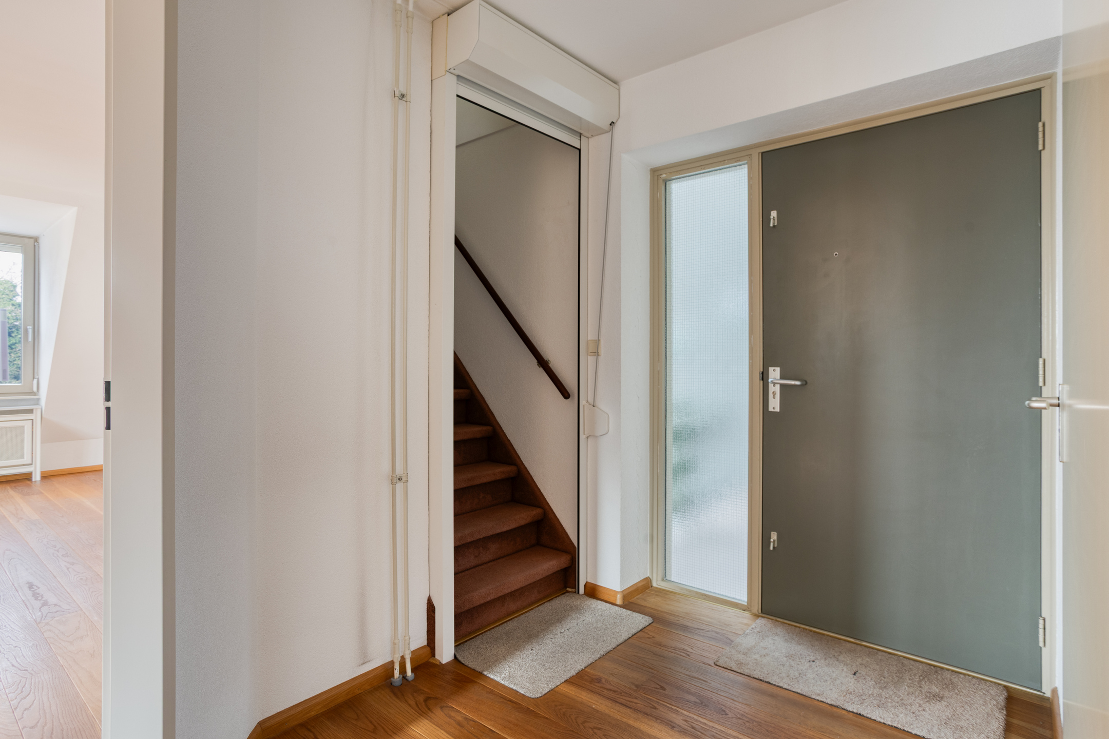 Het appartement is gelegen op de tweede verdieping. Ook hier is de lichtinval in de gezamenlijk hal prettig. De l-vormige hal van het appartement biedt toegang tot alle vertrekken; de living, toilet, badkamer, slaapkamer, bijkeuken en loggia. Ook bevindt zich hier de trapopgang naar de extra verdieping.