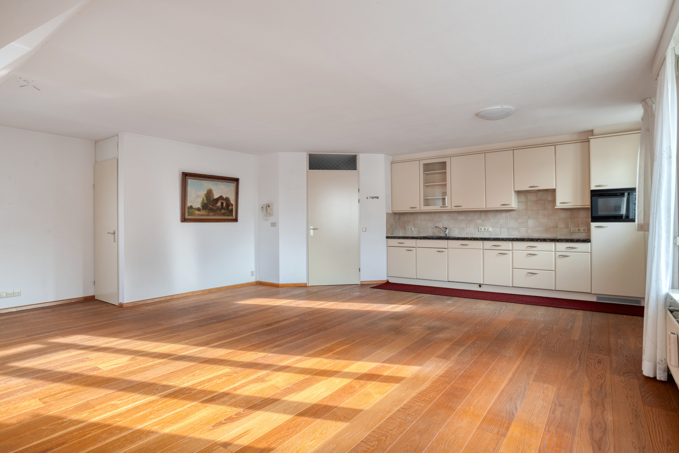 De ruime living heeft twee grote dakkapellen en twee ramen met rolluiken in de zijgevel. De ruimtelijk beleving kan relatief eenvoudig worden aangepast door het aanpassen van de dakkapel. Onder de trapkast bevindt zich een royale bergkast. Net als de hal is de woonkamer voorzien van een houten vloer. De moderne keuken heeft een luxe natuurstenen werkblad, bergruimte in de onder- en bovenkasten, een koelkast, vaatwasser, combimagnetron en een keramische kookplaat.