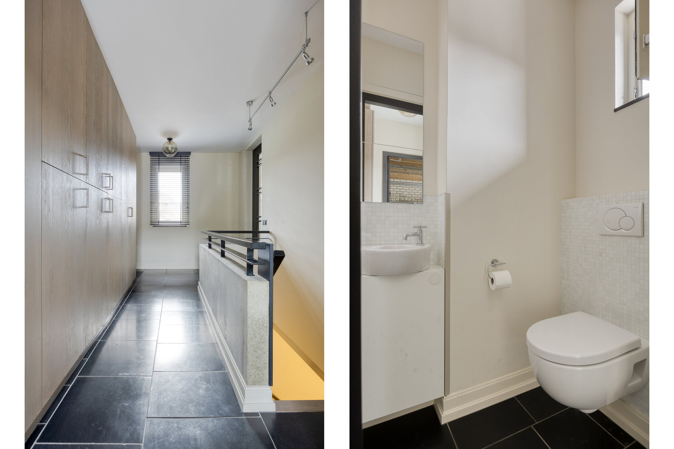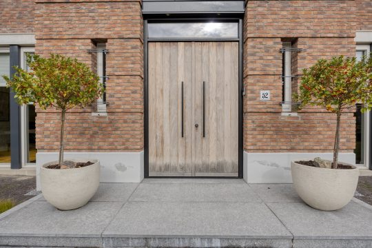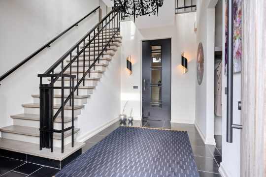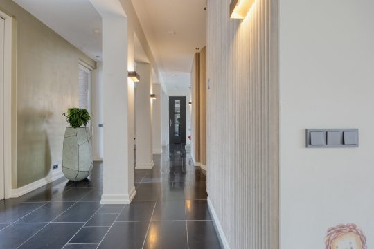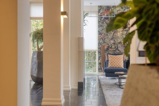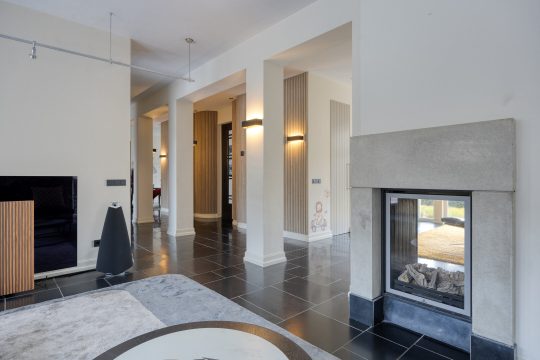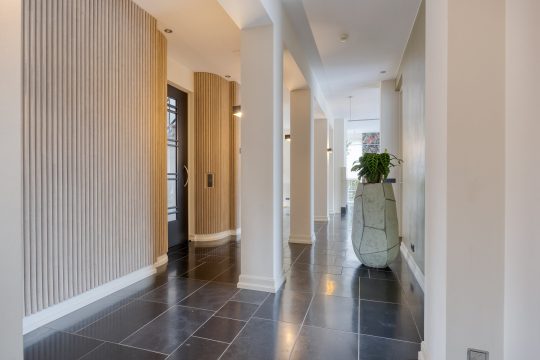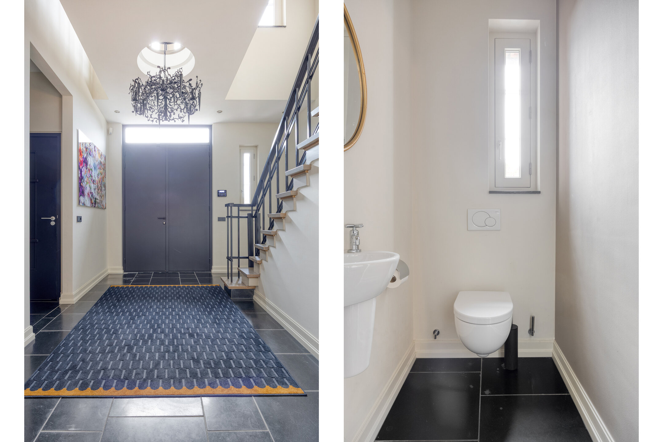Via de hoge dubbele deuren begint de beleving in deze bijzondere villa. De entree maakt direct indruk – met de moderne trappartij als sculpturaal middelpunt, de vide die licht en ruimte brengt, en de kamerhoge taatsdeur die de living onthult. Garderobe en toiletruimte zijn stijlvol geïntegreerd in een nis, onzichtbaar maar doordacht aanwezig.
