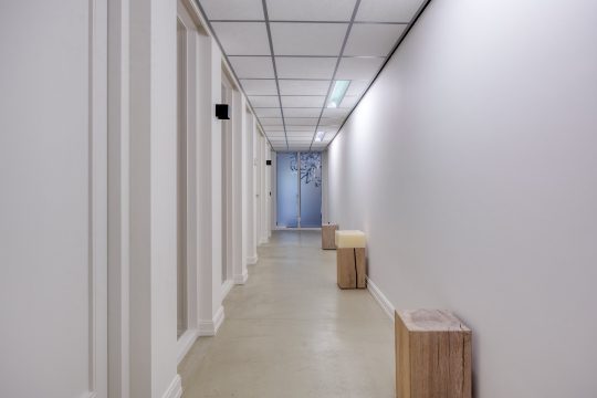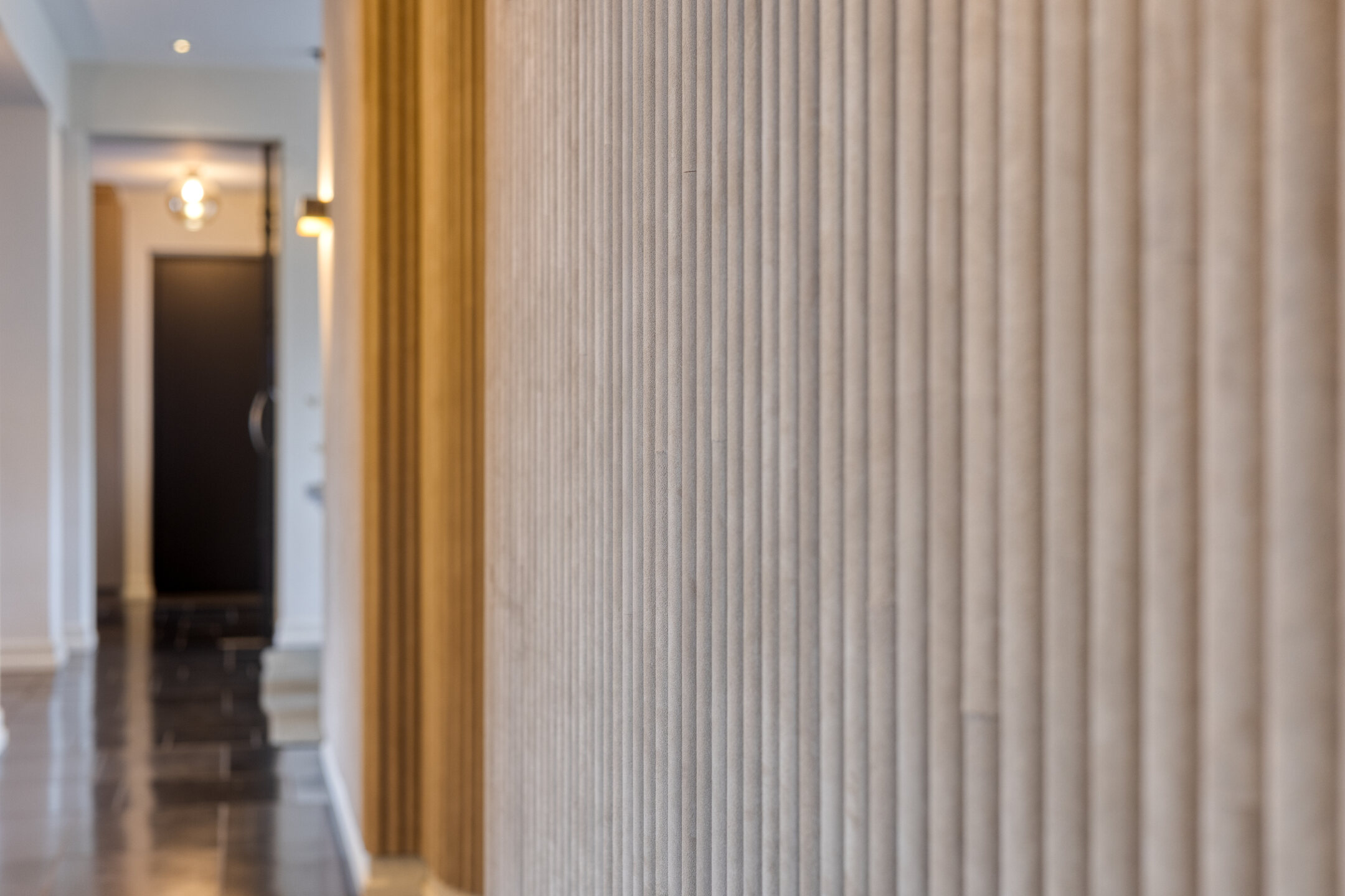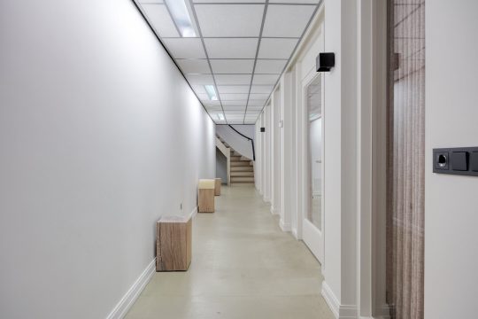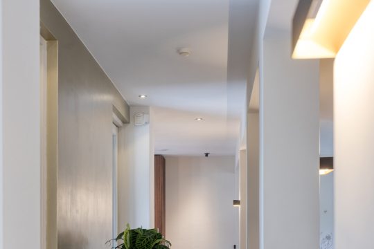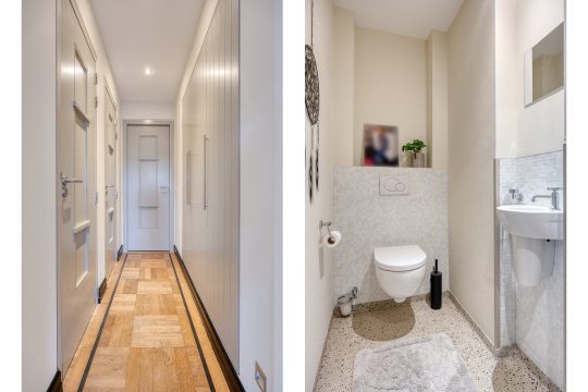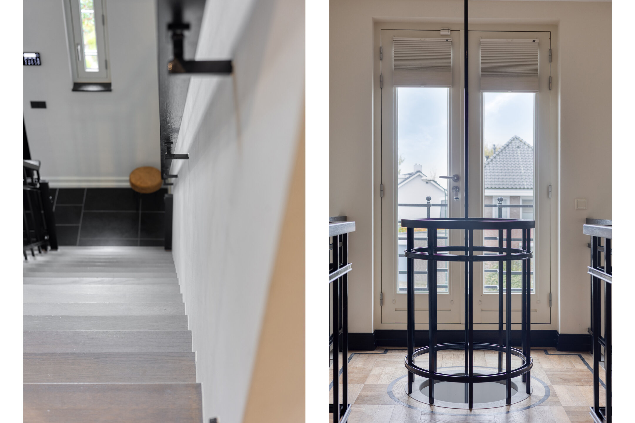 Via de hoge dubbele deuren begint de beleving in deze bijzondere villa. De entree maakt direct indruk – met de moderne trappartij als sculpturaal middelpunt, de vide die licht en ruimte brengt, en de kamerhoge taatsdeur die de living onthult. Garderobe en toiletruimte zijn stijlvol geïntegreerd in een nis, onzichtbaar maar doordacht aanwezig.