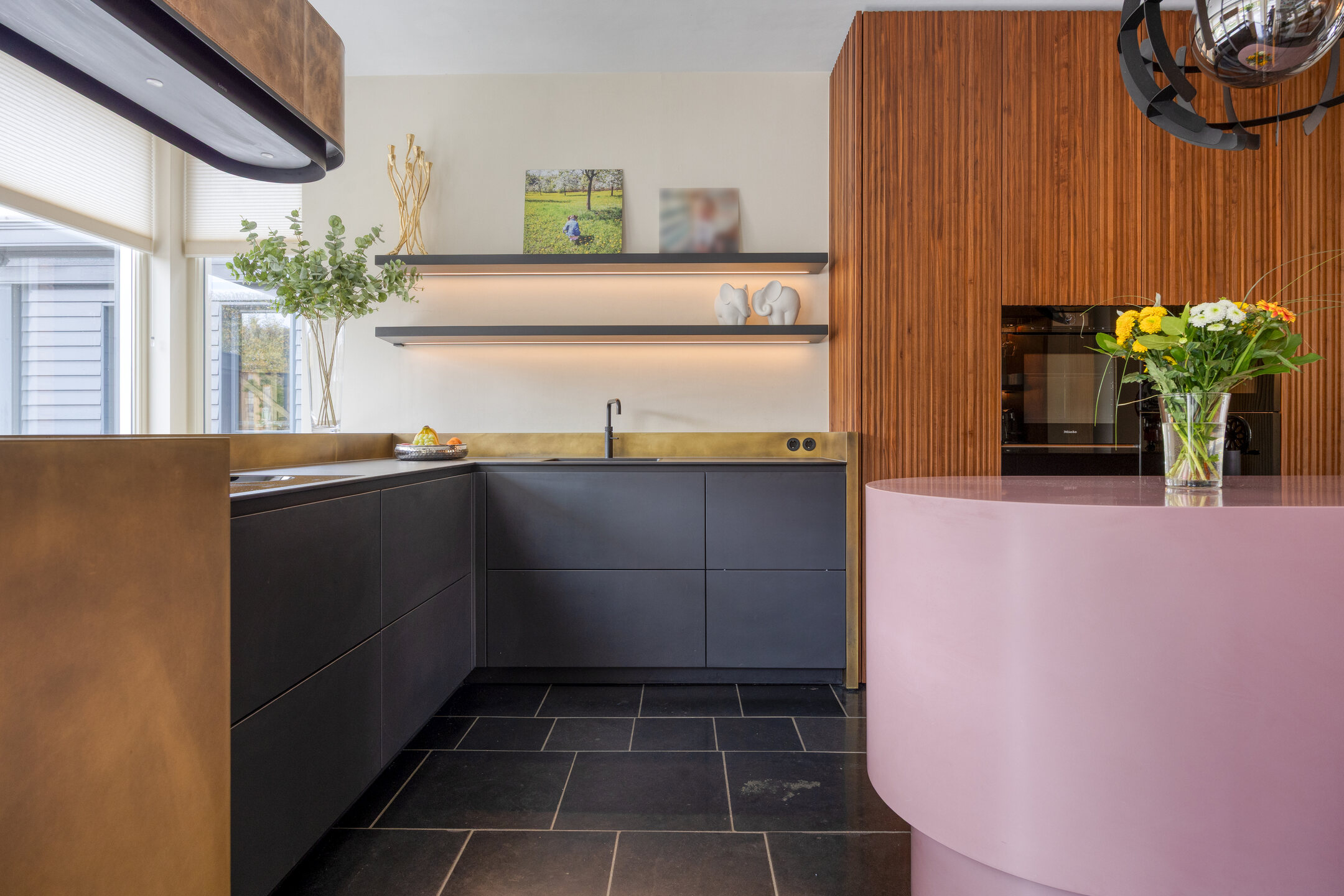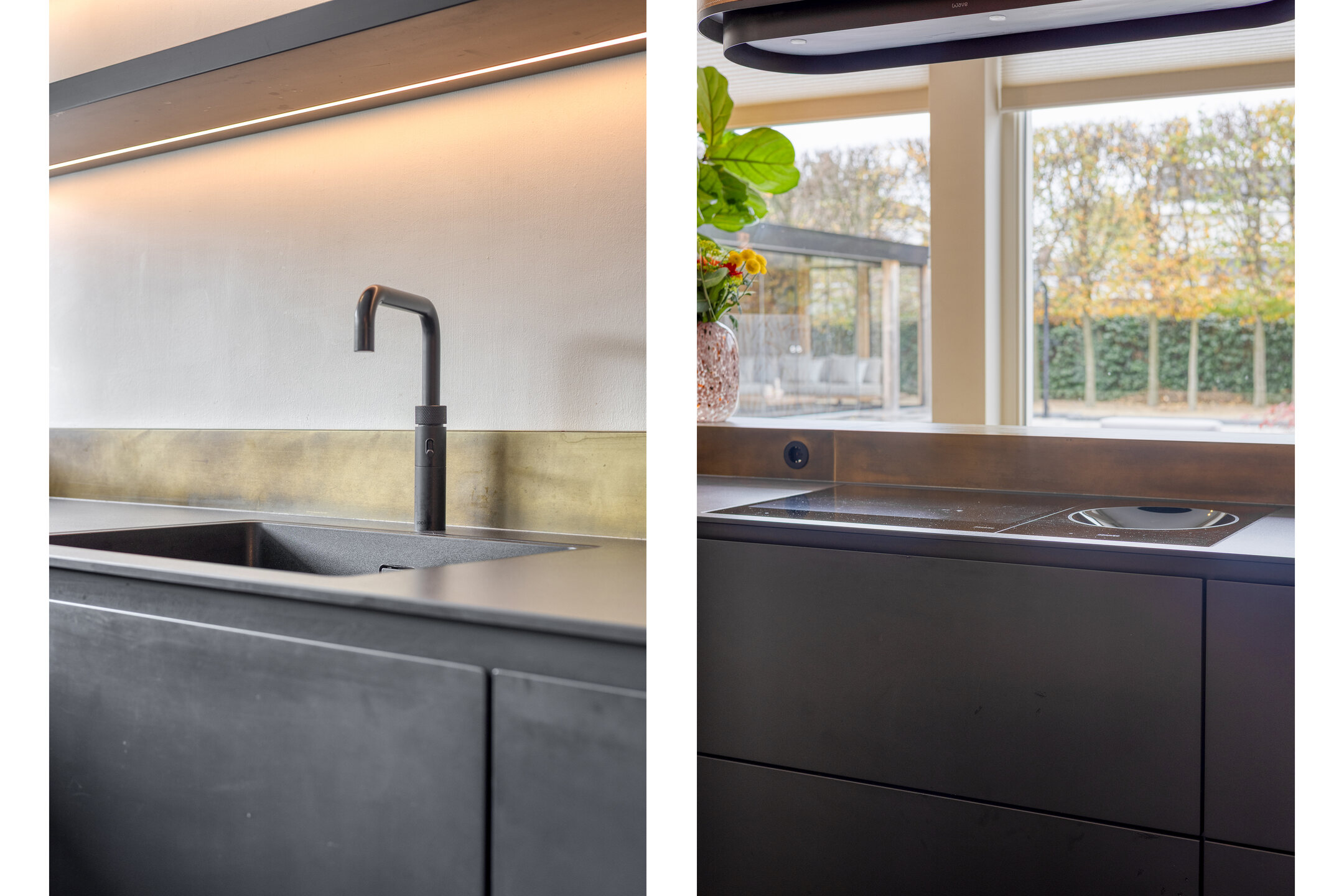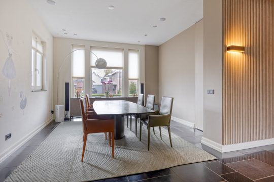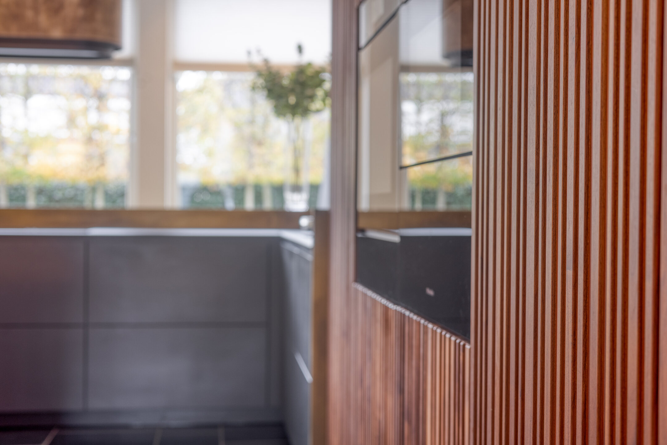De maatwerkkeuken (2023) is een statement van design en vakmanschap. Hier komen vorm, functie en materiaal perfect samen. Het eiland in solid surface oogt strak en minimalistisch, terwijl de hoge kastenwand met Amerikaans noten ribbelfronten warmte en textuur toevoegt. Matzwarte fronten, een gepatineerde messing ombouw en een donker dekton werkblad vormen de finishing touch.Boven de Miele-kookplaat hangt een Wave designafzuigkap; in de koffienis komt marmer Fior di Bosco prachtig samen met notenfineer. Alle apparatuur is van topkwaliteit – van inductiekookplaat met wokkom tot vacuümmachine, bordenwarmer, twee koelkasten, Quooker met kokend en bruisend water, en dubbele ovens. Ook vanuit de keuken is de tuin bereikbaar. De eethoek sluit naadloos aan op de keuken en biedt royaal plaats aan een lange tafel, goede gesprekken en gezellige diners. De grote raampartijen brengen het daglicht diep naar binnen en in de wand is een praktische inloopkast weggewerkt. In het portaal dat de garage met de keuken verbindt bevinden zich een maatwerk kastenwand, een extra toiletruimte, de toegang tot de garage, tuin en het souterrain, en een separate zij entree aan de voorzijde.