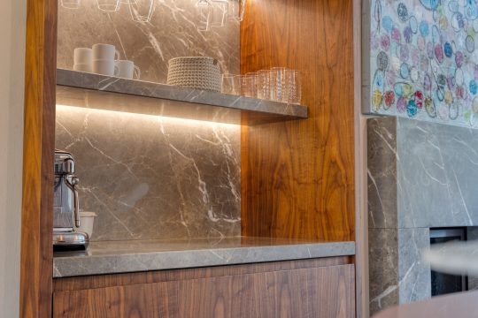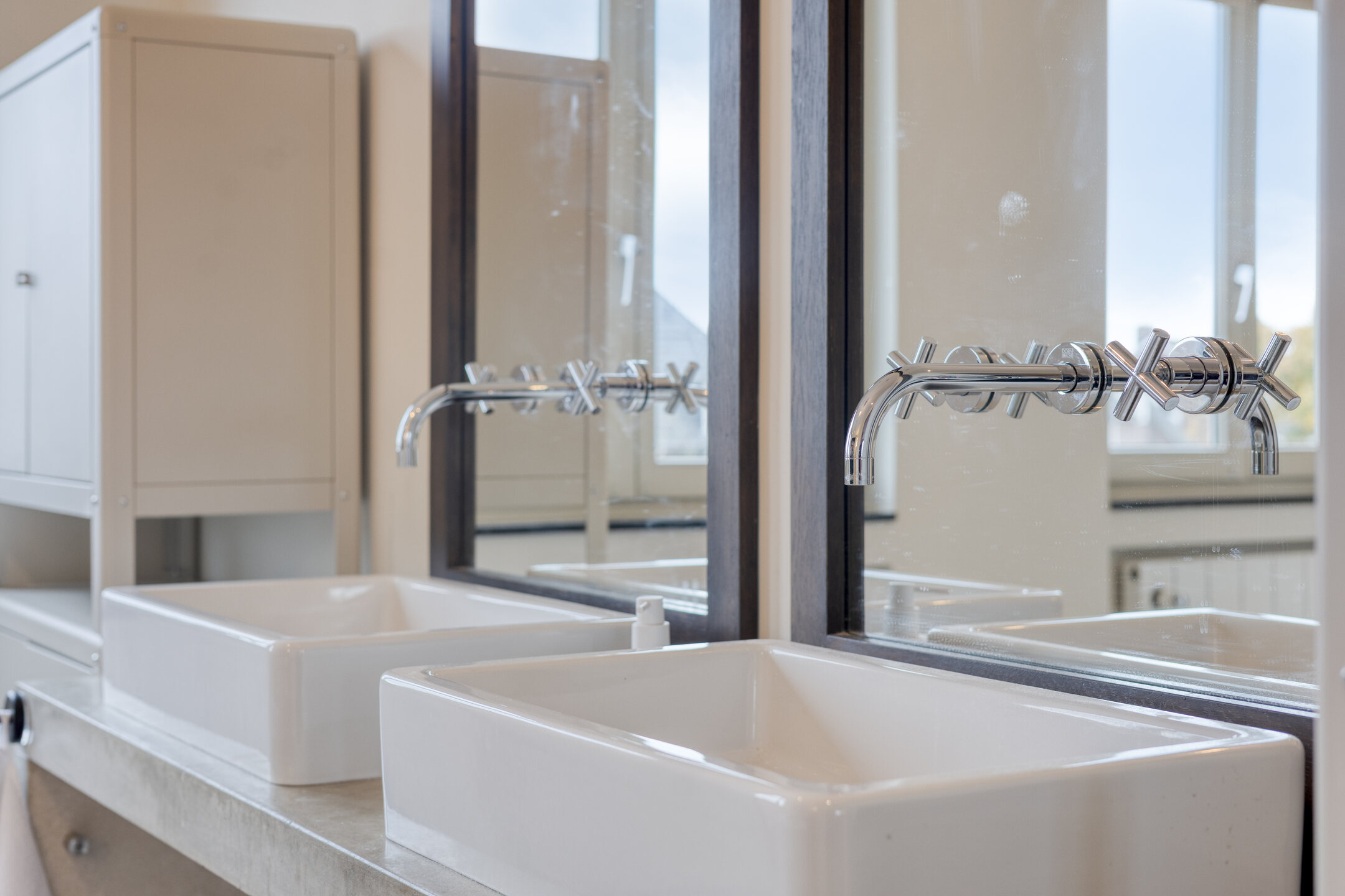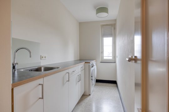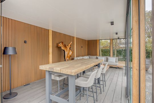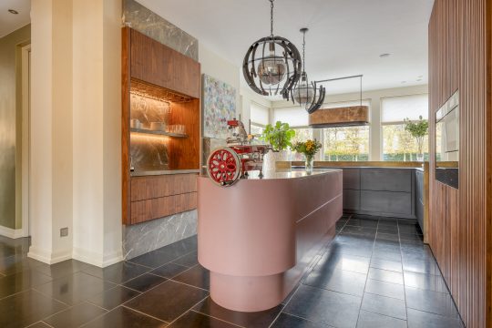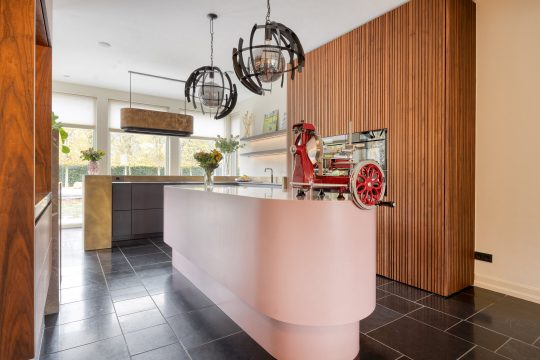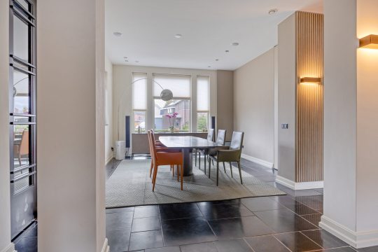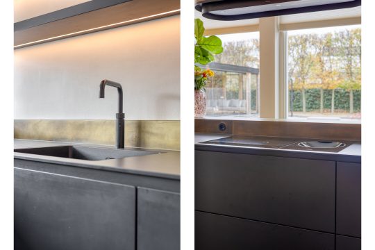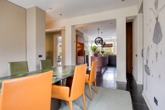 De maatwerkkeuken (2023) is een statement van design en vakmanschap. Hier komen vorm, functie en materiaal perfect samen. Het eiland in solid surface oogt strak en minimalistisch, terwijl de hoge kastenwand met Amerikaans noten ribbelfronten warmte en textuur toevoegt. Matzwarte fronten, een gepatineerde messing ombouw en een donker dekton werkblad vormen de finishing touch.Boven de Miele-kookplaat hangt een Wave designafzuigkap; in de koffienis komt marmer Fior di Bosco prachtig samen met notenfineer. Alle apparatuur is van topkwaliteit – van inductiekookplaat met wokkom tot vacuümmachine, bordenwarmer, twee koelkasten, Quooker met kokend en bruisend water, en dubbele ovens. Ook vanuit de keuken is de tuin bereikbaar. De eethoek sluit naadloos aan op de keuken en biedt royaal plaats aan een lange tafel, goede gesprekken en gezellige diners. De grote raampartijen brengen het daglicht diep naar binnen en in de wand is een praktische inloopkast weggewerkt. In het portaal dat de garage met de keuken verbindt bevinden zich een maatwerk kastenwand, een extra toiletruimte, de toegang tot de garage, tuin en het souterrain, en een separate zij entree aan de voorzijde.