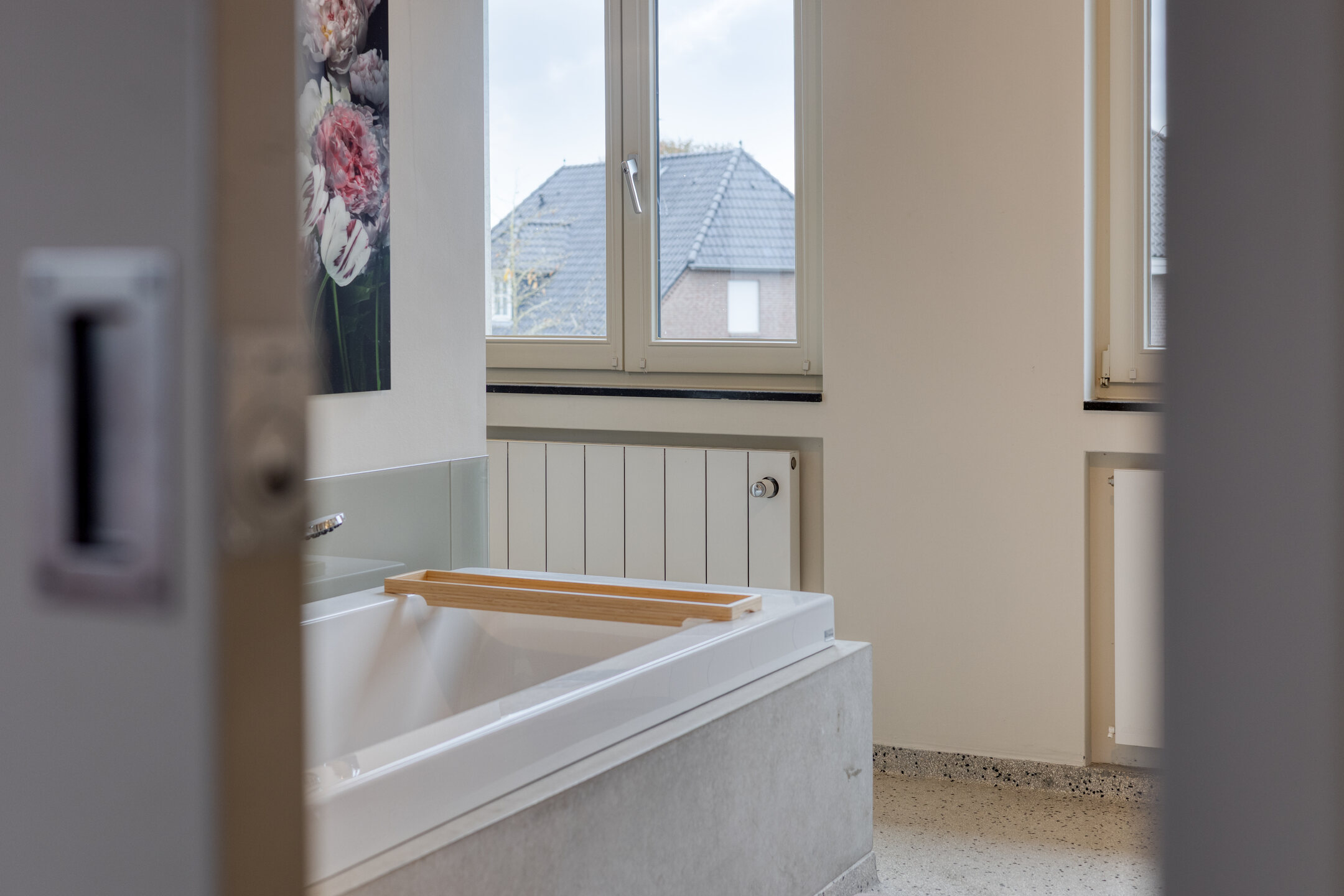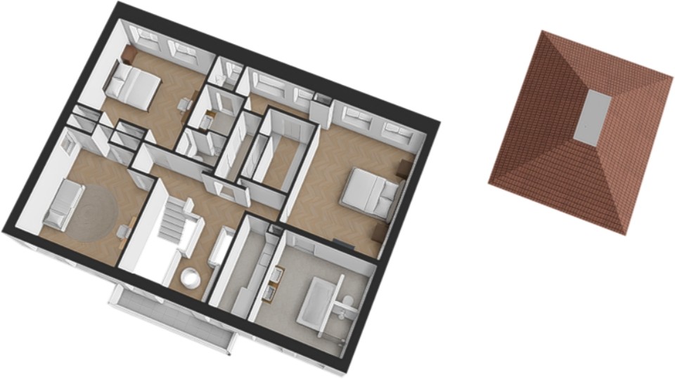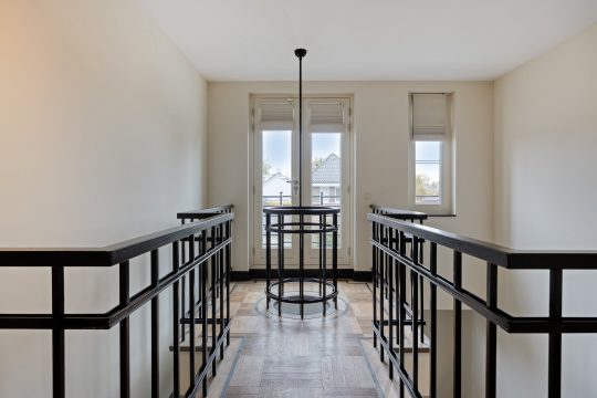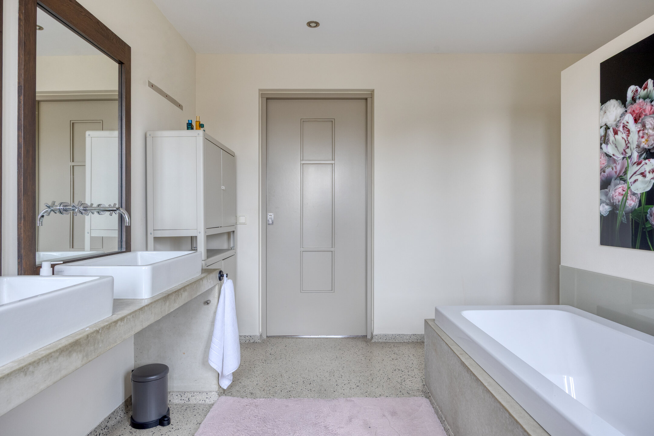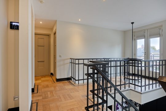 Op de eerste verdieping komt het gebalanceerde Hertroijs ontwerp tot uiting in comfortabele lay-out en de consequent doorgevoerde details. Eyecathers zijn de stalen balustrades en het doorkijkdetail op de overloop. Ook de balkons in de voor- en achtergevel dragen bij aan de uitstraling van de villa. De combinatie van massief parket en terrazzo vloeren ademt tijdloze klasse. De master bedroom met en suite badkamer en walk-in closet biedt het comfort van een luxe hotelsuite. De badkamer is compleet uitgevoerd met een ligbad en een dubbel wastafelmeubel met opzet waskommen. De inloopdouche en het toilet bevinden zich beiden achter een discreet manshoog wandje. De walk-in-closet heeft lades en hang- en legkasten. Ook de twee overige slaapkamers zijn royaal bemeten en beschikken allebei over een maatwerk kastenwand. De tweede badkamer heeft een betonnen wastafelmeubel met een opzetwaskom en een royale inloopdouche, in dezelfde stijl als het overige sanitair in de villa. Naast deze badkamer bevindt zich de separate toiletruimte. Ook is er een extra maatwerkkastenwand. Een praktische extra is de waskamer met de aansluitingen voor wasapparatuur en een pantry met gootsteen. Een vlizotrap biedt toegang tot bergzolder waar de cv ketel en binnenunit van de warmtepomp zijn geplaatst.