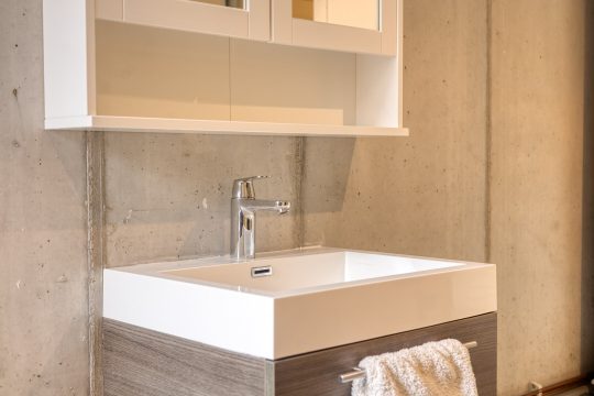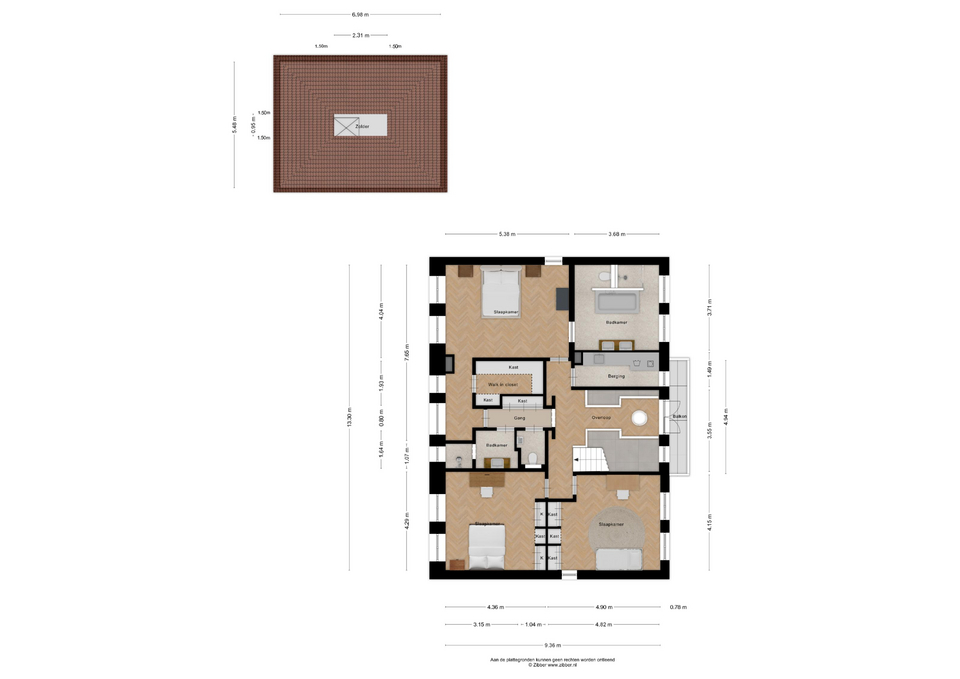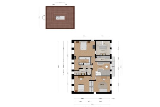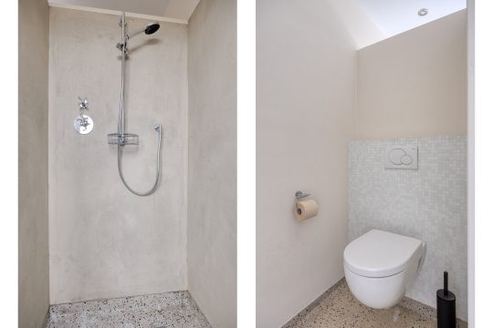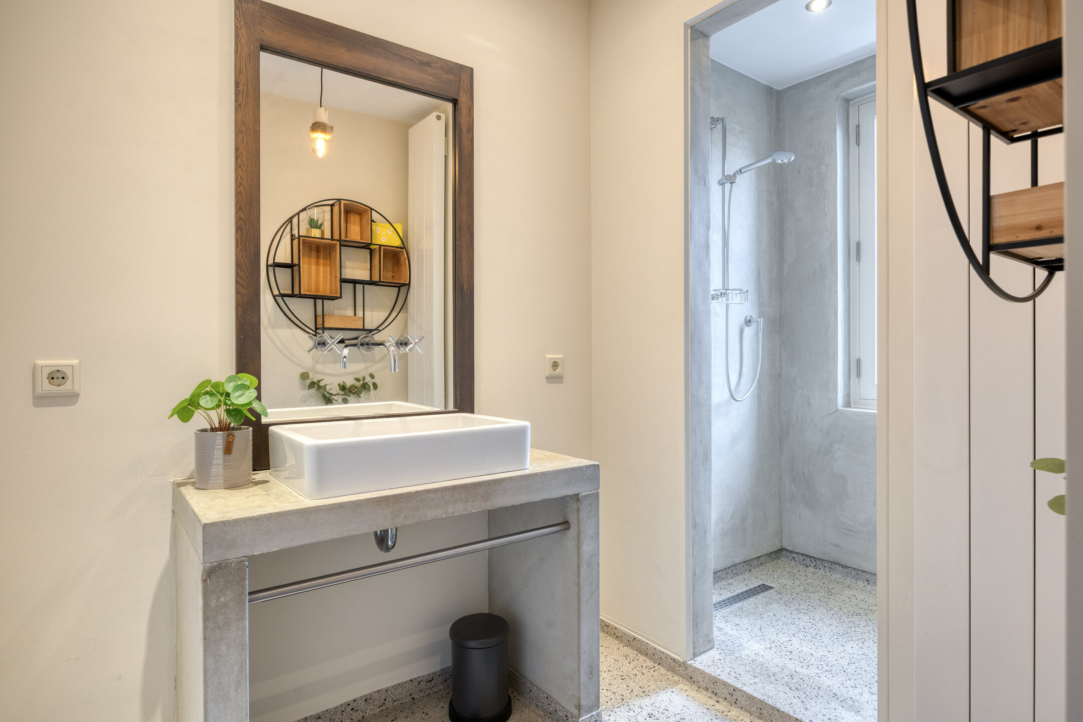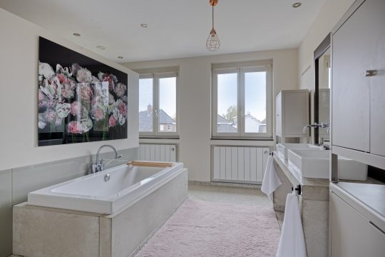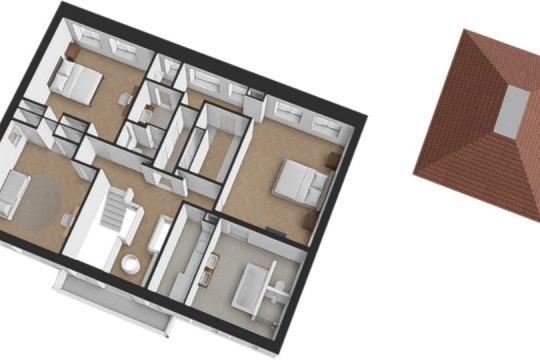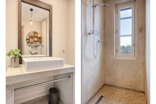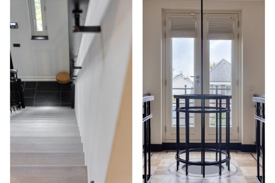Op de eerste verdieping komt het gebalanceerde Hertroijs ontwerp tot uiting in comfortabele lay-out en de consequent doorgevoerde details. Eyecathers zijn de stalen balustrades en het doorkijkdetail op de overloop. Ook de balkons in de voor- en achtergevel dragen bij aan de uitstraling van de villa. De combinatie van massief parket en terrazzo vloeren ademt tijdloze klasse. De master bedroom met en suite badkamer en walk-in closet biedt het comfort van een luxe hotelsuite. De badkamer is compleet uitgevoerd met een ligbad en een dubbel wastafelmeubel met opzet waskommen. De inloopdouche en het toilet bevinden zich beiden achter een discreet manshoog wandje. De walk-in-closet heeft lades en hang- en legkasten. Ook de twee overige slaapkamers zijn royaal bemeten en beschikken allebei over een maatwerk kastenwand. De tweede badkamer heeft een betonnen wastafelmeubel met een opzetwaskom en een royale inloopdouche, in dezelfde stijl als het overige sanitair in de villa. Naast deze badkamer bevindt zich de separate toiletruimte. Ook is er een extra maatwerkkastenwand. Een praktische extra is de waskamer met de aansluitingen voor wasapparatuur en een pantry met gootsteen. Een vlizotrap biedt toegang tot bergzolder waar de cv ketel en binnenunit van de warmtepomp zijn geplaatst.
