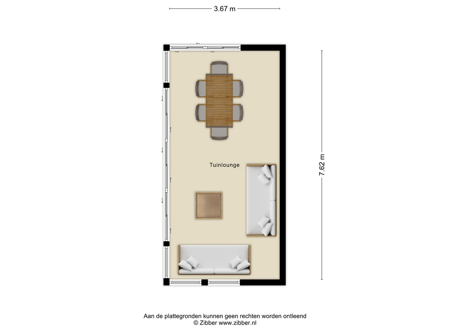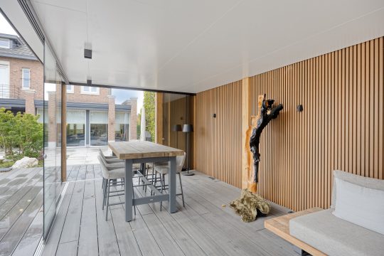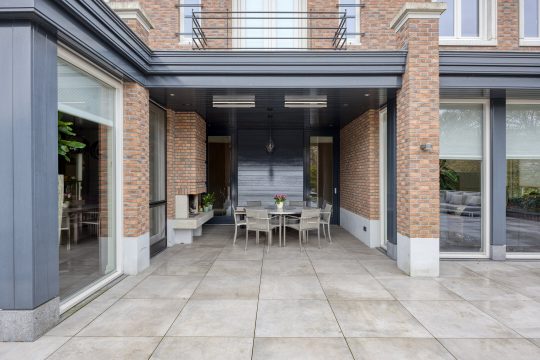 De living biedt via dubbele deuren toegang tot het overdekte terras met buitenhaard.